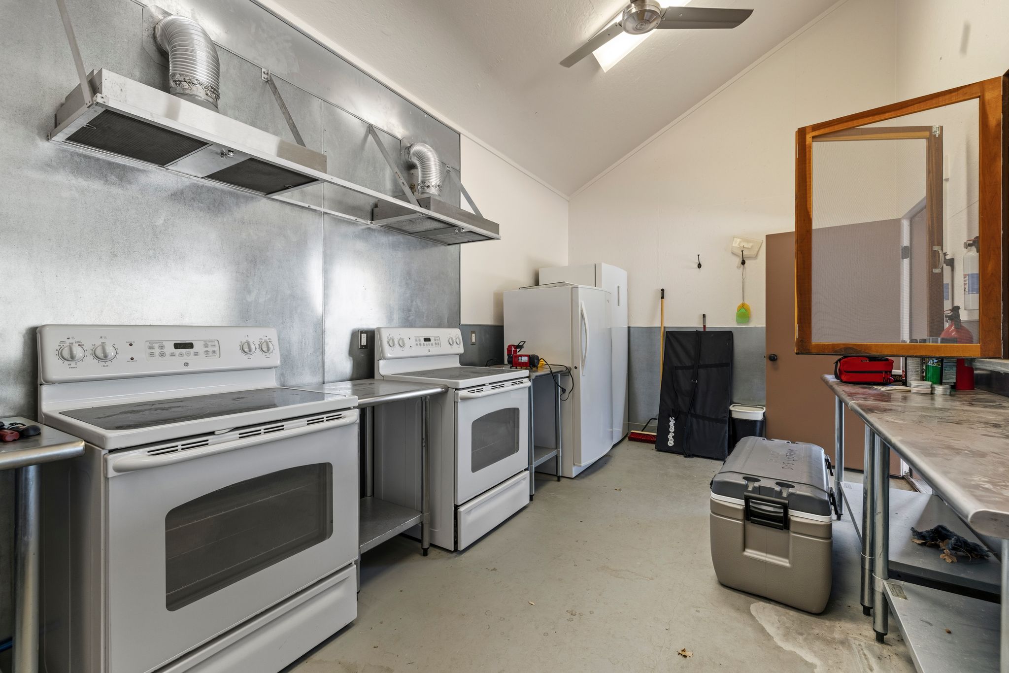 Cooking Pavilion large open-air structure featuring a stone-enclosed camp kitchen with serving window, stone seating wall, vaulted covered concrete deck, ideal for entertaining, plus 1/2 bath and nearby fire pit patio overlooking the first tank and valley